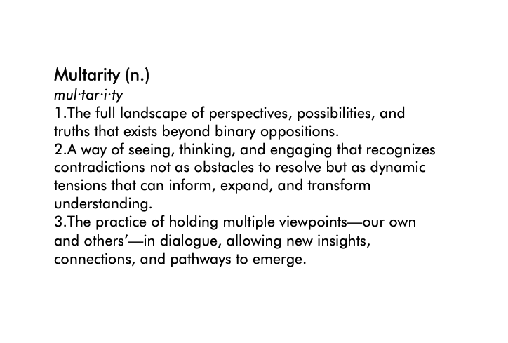The Multarity Project® posits that any idea, topic, or concept that traditionally would have us “polarized” actually has multiple perspectives, multiple angles, and multiple ways of seeing it. When we view those multiple perspectives as a whole, we call that a MULTARITY.